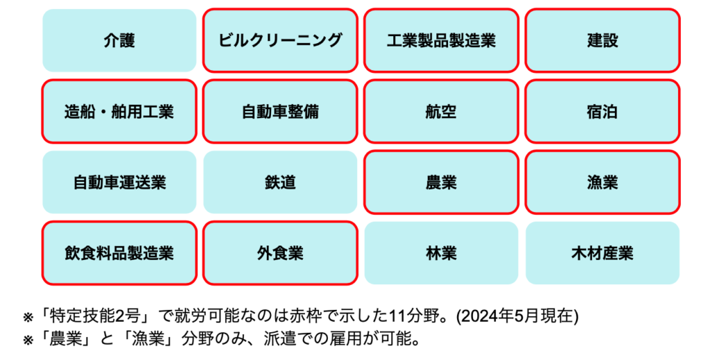2024年5月現在、特定技能で就労可能な分野は以下の16分野です。(特定技能2号で就労可能なのは赤枠で示した11分野)