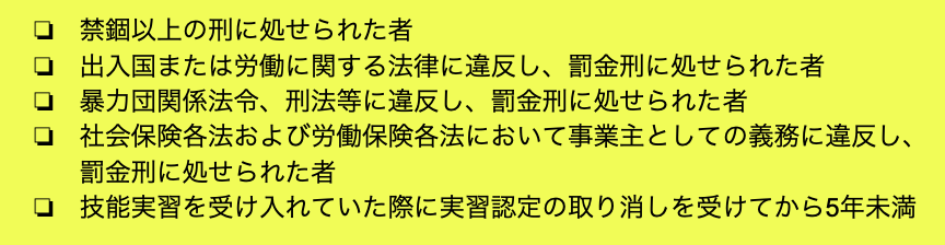 また、「欠格事由」といって、以下のような項目に該当する場合は、受け入れ企業として活動することができません。